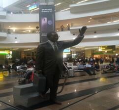 走下飛機順利完成通關(guān)驗證與提取行李,趕到航站樓接機出口,迎面是一尊眼帶黑框眼鏡、手提公文包、揮手致意,信步走下懸梯的黑人銅像,這是南非黑人解放運動領(lǐng)導(dǎo)人奧利弗·坦博銅像,該機場命名也是為了紀念這位與曼德拉齊名的已故前南非國會主席,令人印象深刻。