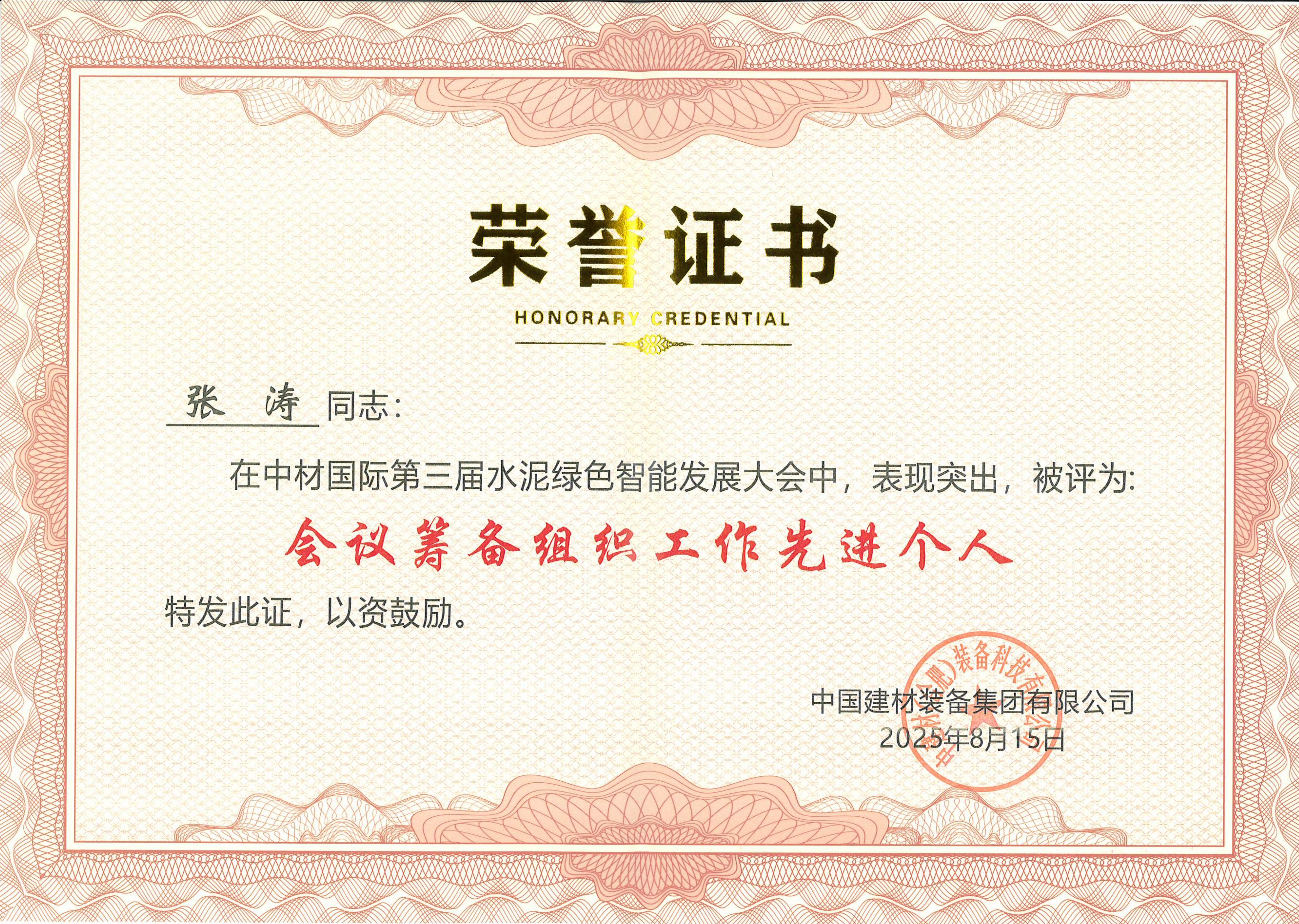 近日,在中材國際第三屆水泥綠色智能發(fā)展大會的表彰環(huán)節(jié)中,我司憑借在會議籌備組織保障工作中的優(yōu)秀表現(xiàn),榮獲“會議籌備組織保障先進集體”榮譽稱號,我司員工張濤因表現(xiàn)突出榮獲“會議籌備組織工作先進個人”榮譽稱號,這不僅是對我司工作的高度認可,更是對全體參與籌備人員辛勤付出的最佳褒獎。